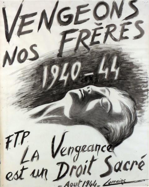 Vengeons nos frères 1940 1944, FTP. La vengeance est un droit sacré, affiche, Robert Petit-Lorraine, 0,65 × 0,50 m (1er août 1944). Collection d’affiches du musée de la Résistance et de la Déportation en Ardèche, Archives départementales de l’Ardèche, 98 Fi 2.