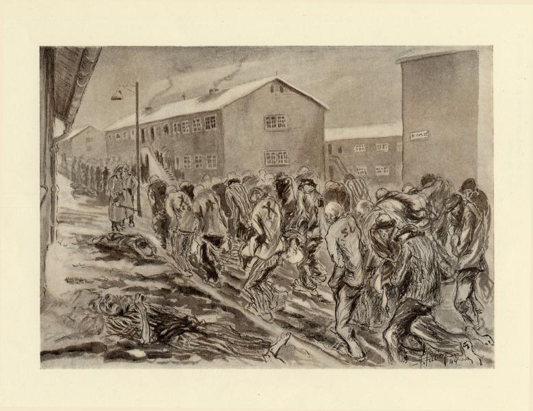 28 - "Arrivée d'un Kommando replié sur Buchenwald", Dessin de Auguste Favier (1944)