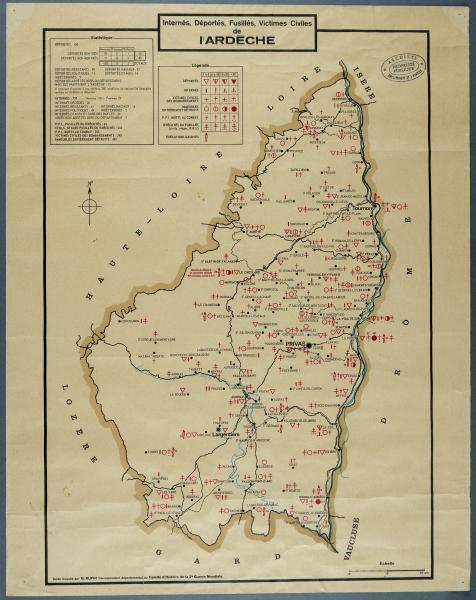 Dénombrement par commune des internés, déportés, fusillés et victimes civiles reportés sur la carte de l'Ardèche, carte dressée par Georges Rufin pour le Comité d'histoire de la Deuxième Guerre mondiale (sans date). Archives départementales de l’Ardèche, 57 J 46.