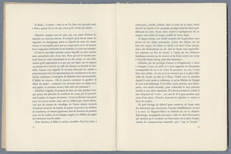 Auschwitz, Buchenwald, Bergen, Dora, croquis clandestins de Léon Delarbre, Paris, Michel de Romilly (1945). Extrait de la préface de P. Maho, pages X et XI. Archives départementales de l’Ardèche 70 J 2.
