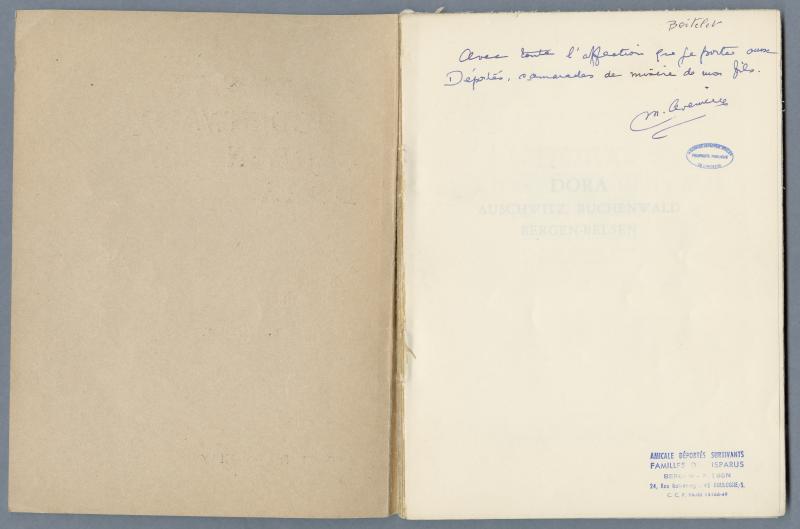 Auschwitz, Buchenwald, Bergen, Dora, croquis clandestins de Léon Delarbre, Paris, Michel de Romilly (1945). Page de couverture et dédicace. Archives départementales de l’Ardèche 70 J 2.