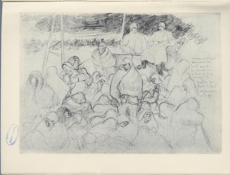Auschwitz, Buchenwald, Bergen, Dora, croquis clandestins de Léon Delarbre, Paris, Michel de Romilly (1945). Croquis comportant la légende suivante : "Le transport de Dora à Bergen : cinq nuits quatre jours dans la pluie et le froid. Nous étions 100 par wagon, sans toit, sans nourriture, sans eau et presque sans vêtement." (avril 1945). Archives départementales de l’Ardèche 70 J 2.
