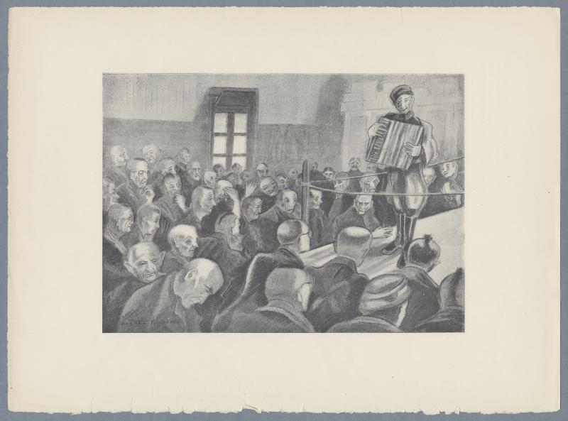Buchenwald, scènes prises sur le vif des horreurs nazies, 78 planches dessinées par Auguste Favier, Pierre Mania, Boris Taslitski, préface de C. Pineau, textes de Pierre Mania, 1946. Planche avec la légende suivante : "De temps en temps, certains dimanches, les SS permettaient l'organisation de concerts où entre Déportés on faisait assaut de bonne humeur. Mais certains camarades se laissaient aller à dormir de fatigue." Archives départementales de l’Ardèche, BIB-F 461.