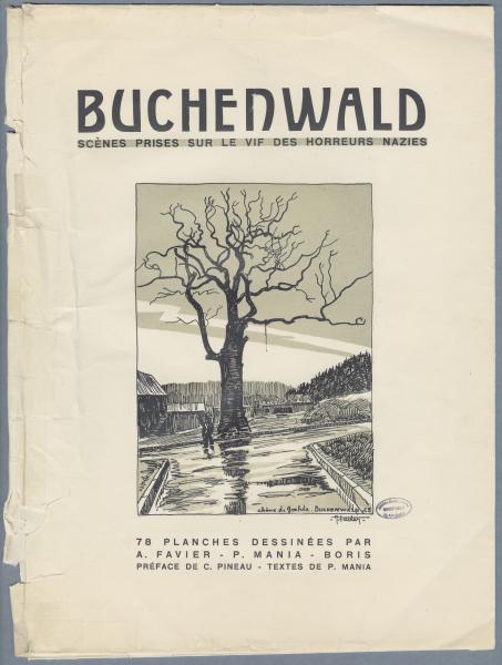 Buchenwald, scènes prises sur le vif des horreurs nazies, 78 planches dessinées par Auguste Favier, Pierre Mania, Boris Taslitski, préface de C. Pineau, textes de Pierre Mania, 1946. Page de couverture. Archives départementales de l’Ardèche, BIB-F 461.